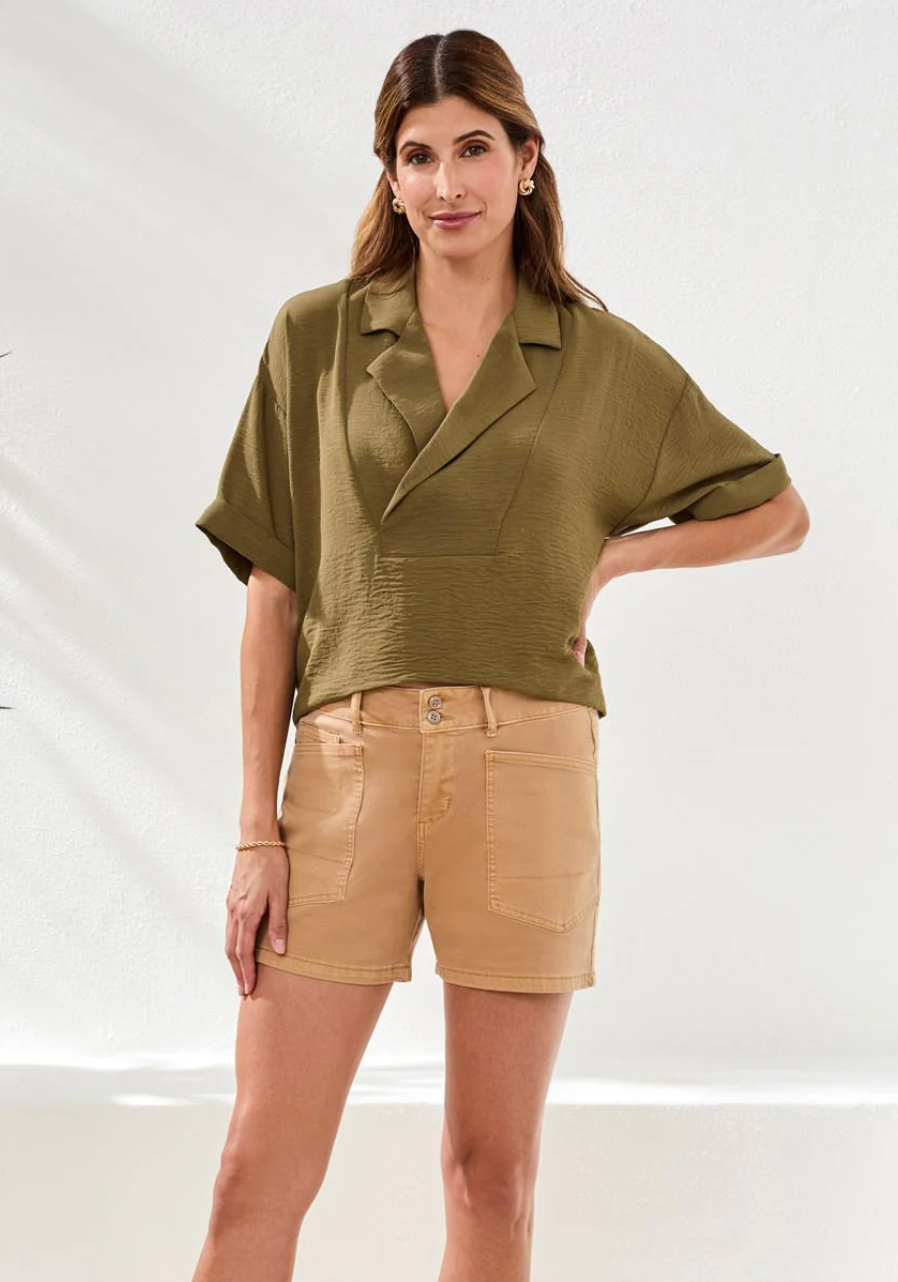 Crisp, classic, and cool—this fly front denim short features a five-pocket design and structured feel for versatile, everyday style. Perfect for sunny days on the go.
