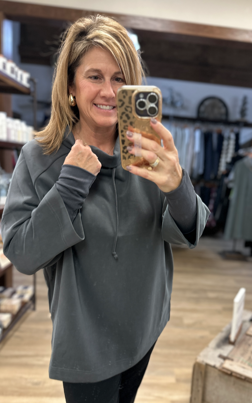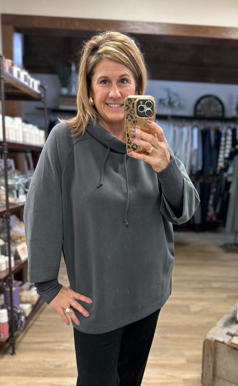 You will wan to live in this top once you try it on!  Scuba fabric with mock neck and ribbed sleeves.  Very unique piece!