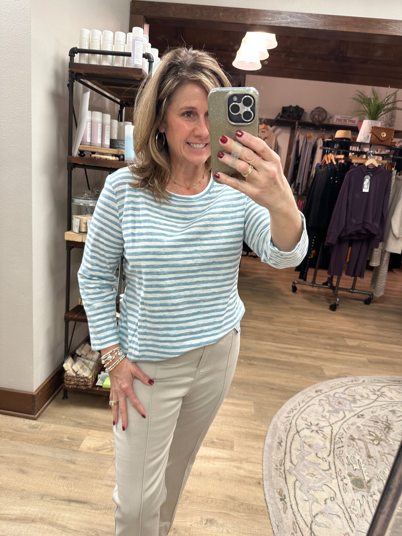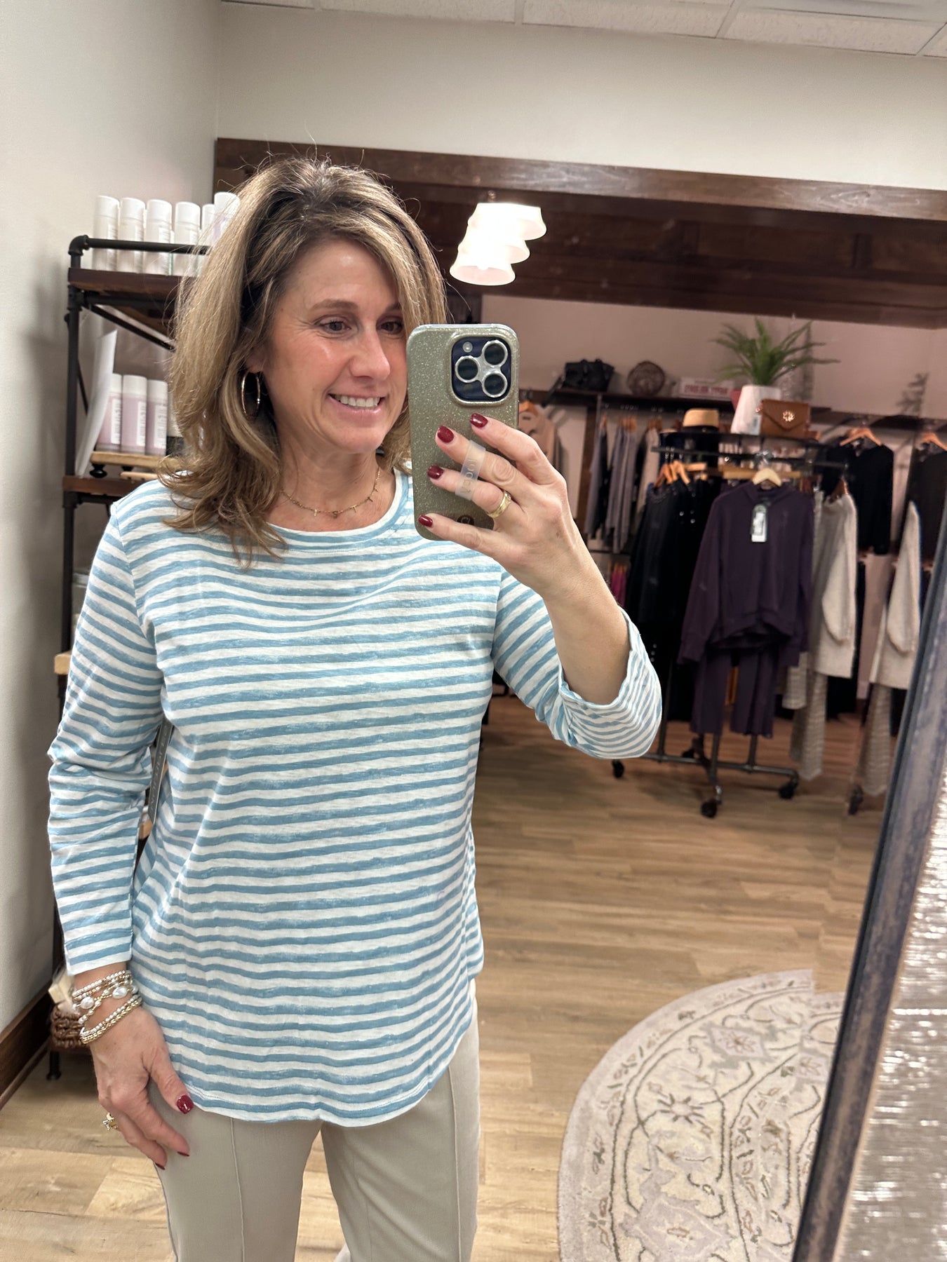 This easygoing top combines everyday comfort with subtle style details. Crafted from soft cotton slub knit, it features a flattering scoop neckline and a printed stripe design for a casual, laid-back look. The 3/4 sleeves and shaped hem create a relaxed yet polished silhouette perfect for daily wear.